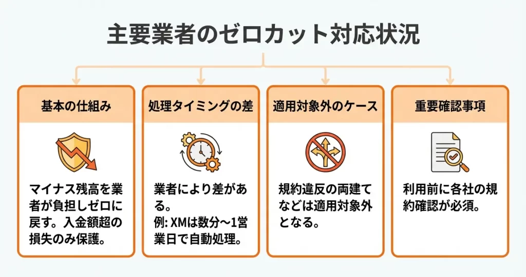 海外FX業者の多くはゼロカットシステムを提供していますが、適用タイミングや公式情報の開示状況には差があります