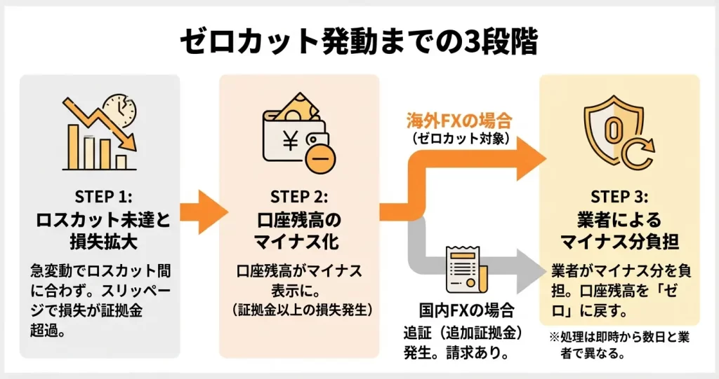 ここでは、口座残高がマイナスになる状況から、実際にゼロカットが適用されるまでの3つの段階を、具体的なプロセスとして解説します。