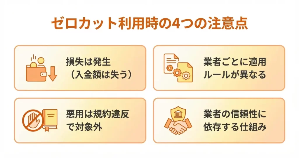 ただし、ゼロカットは「取引リスクがゼロになる」という意味ではありません。