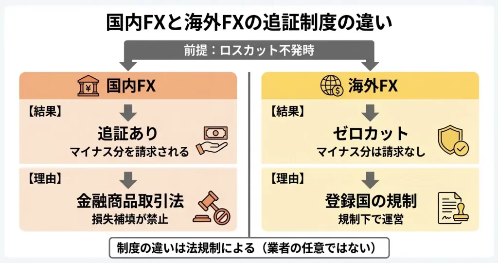 ここまでゼロカットが実際に発動するプロセスを見てきましたが、次のセクションでは、なぜ国内FX業者ではこの仕組みが提供されておらず、海外FX業者だけが採用できるのか、その背景にある法規制と業者のビジネスモデルの違いを確認していきます。